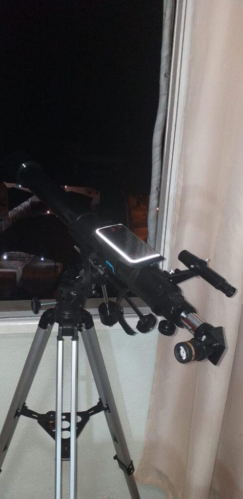 Para isso ele prendeu o telefone com uma braçadeira no seu telescópio e fez a calibragem da estrela, com o uso do aparelho em modo noturno(observe na imagem que o visor está avermelhado, isso preserva a visão noturna), pode desfrutar da observação de um modo muito mais tranquilo para procurar os astros desejados.